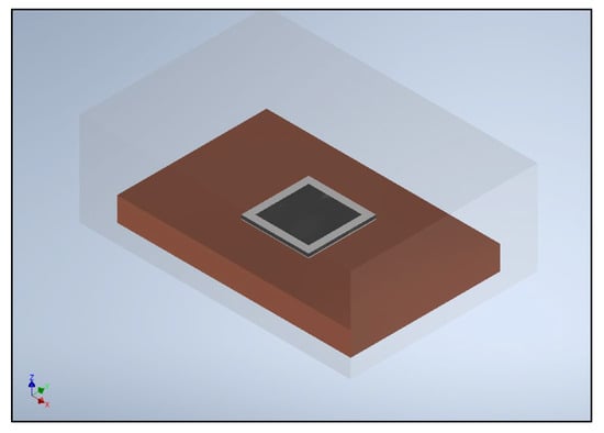 With this main aim, the delamination behavior of a generic power electronics package subjected to a linear law of temperature–time is herein simulated. Two main modeling choices are employed: a global–local approach and the utilization of cohesive elements to model one of the package’s critical interfaces. The representative power electronics package considered in this study adopts one of the layers layouts possible for this kind of component [26], as shown in the qualitative diagram of Figure 1. Specifically, the layers are, from bottom to top, the copper base plate; the solder layer (PbSnAg), which realizes the structural and electrical connection with the upper silicon-based layer (silicon carbide, SiC); and the following layer of TEOS (tetraethyl orthosilicate), which provides the silicon source for the successive deposed layer of silicon nitride (Si3N4). The whole multilayer package is then encapsulated in a thermosetting resin. According to the isometric view of the package in Figure 2, the resin surrounds the whole package and fills the inner central square cavity within the TEOS and SiN layers.