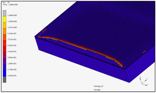 During the local simulations, at every step and for every cohesive element, the damage variable is calculated depending on the displacement of the corresponding nodes. Once the damage variable reaches the unit value, the element is deactivated. The effect of the cohesive elements’ characteristics on the reliability of the package is measured in terms of the percentage of cohesive elements delaminated at the end of the simulation. An example of the output from the local model is shown in Figure 5, in which the damage variable is presented as a model plot. The fully damaged cohesive elements have been automatically removed and the current crack front at the given analysis increment is identified by the cohesive elements not yet removed from the model exhibiting a damage value close to one (yellow band).