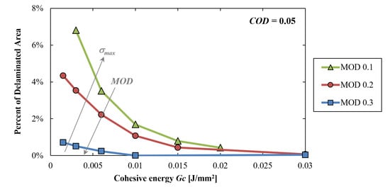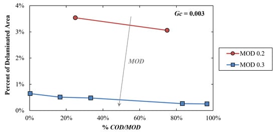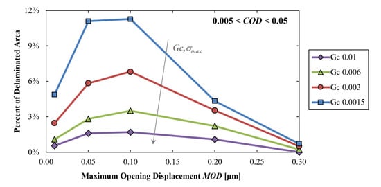 Figure 7 shows the influence of the MOD on the delaminated area. Given its negligible influence, COD is set between 0.005 µm and 0.05 µm in all simulations. The curves, parametrized with Gc, are characterized by a somehow common trend with a peak of delamination for MOD around 0.1 µm and a progressively extinguishing delamination as the MOD approaches 0.3 µm. Instead, the delaminated area at very low values of MOD exhibits certain differences depending on the specific energy Gc. Moreover, for a given value of MOD, the delaminated percent area increases with decreasing Gc.