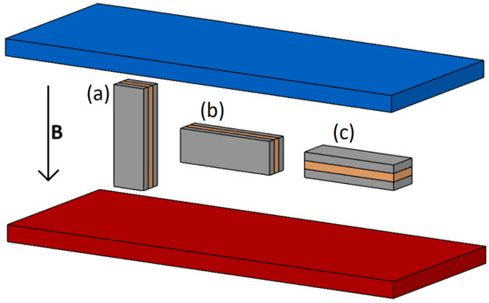 The structures were subjected to DC resistance measurements under the influence of an external magnetic field. All measurements were carried out at room temperature. Strong neodymium magnets mounted on linear guides were used as the source of the external magnetic field. The variable distance between the magnets resulted in a change in the induction of the magnetic field applied to the layer system located between the magnets. The range of changes in the magnetic field induction was 0–0.3 T. Each of the samples were placed in the magnetic field in three different positions relative to the direction of the magnetic field as shown in Figure 2, and in the remainder of the article are referred to as position (a), (b) and (c). For position (a), both the direction of current flow through the structure and plane of the layers are in alignment with the direction of the magnetic field. Position (b) is characterized by the perpendicularity of the direction of current flow and parallelism of the plane of the layers to the direction of the magnetic field. Position (c) from position (b) is differentiated by the perpendicularity of the plane of the sample surface to the external magnetic field.