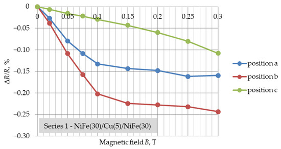 Figure 3, Figure 4 and Figure 5 present the determined GMR coefficients (ΔR/R) for three series of NiFe/Cu/NiFe samples as a function of variable magnetic field induction (ΔR/R = f(B)) for three different positions. The measurement points in Figure 3, Figure 4 and Figure 5 represent the result of the arithmetic mean of the coefficients of five different samples of one series.