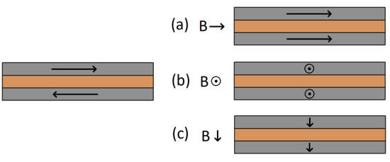 Directions of magnetization of ferromagnetic layers: left—in the absence of magnetic field, right—in the external magnetic field; for each position (a), (b) and (c) the directions of magnetization are parallel to the induction B of the external magnetic field.