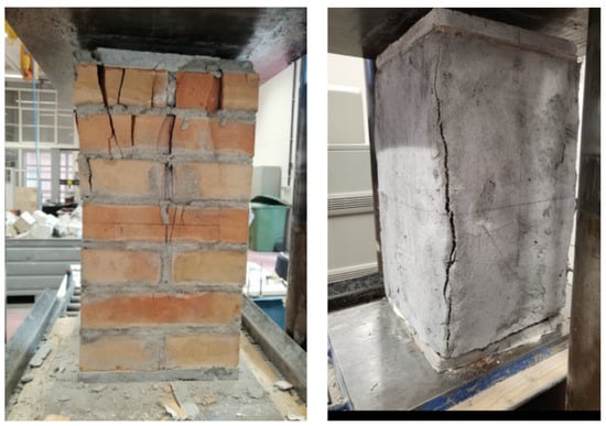 Clay brick masonry columns fully confined with Carbon–FRCM (C–FRCM) have been tested under both axial and eccentrical loads []. The strength of confined columns increases significantly (almost 80%) with respect to that for unconfined columns; the increase was more limited and strongly dependent on the confinement ratio in eccentrically loaded columns (20 and 43% for single layer and two-layers C–FRCM jackets, respectively). All tested columns exhibited a gradual and pseudo-ductile failure due to the rupture of the carbon textile.