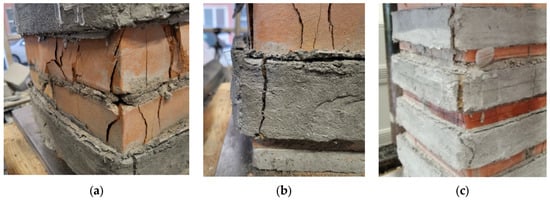 It was noticed that the higher the number of FRCM wraps (i.e., the lower the vertical spacing ratio), the more the failure was dominated by the corner effect. As illustrated in Figure 5a, in fact, for the highest values of the vertical spacing ratio (CD1L-PBO3 columns) at failure, widespread crumbling and the expulsion of brick chips in the unconfined zones were observed while in the confining jacket at the bottom of the column, a vertical cracks appeared in the proximity of the corner (Figure 5b). On the contrary, the failure of the CD1L-PBO5 columns, for which the lowest is the vertical spacing ratio, occurred for the detachment of the PBO FRCM jackets at the corners, while the masonry in the un-confined zones suffered limited damage (Figure 5c).