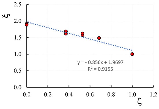 Figure 7 reports the variation of the confinement ratio ξ with the vertical spacing ratio ζ; it is evident that the ξ-ζ variation is well described by a linear relationship. As reported in Figure 7, the correlation coefficient of the trend line of the ξ-ζ law is indeed close to 1 (R2 = 0.9155). In other words, the more the strengthening scheme is distributed along the entire height of the columns, the higher the peak load obtained.