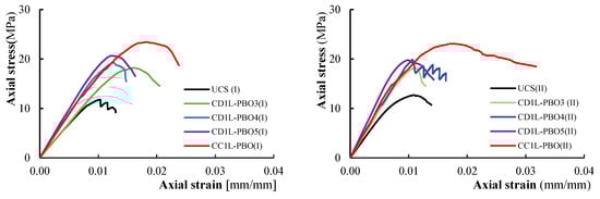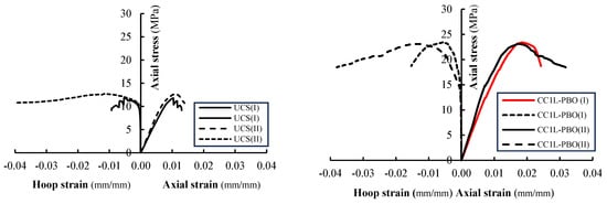 As shown in Figure 8 and Figure 9, the initial slope of the curves’ axial stress-axial strain for low values of the load is similar for all the tested columns (both unconfined and confined). This means that at this stage, the confinement is not active.