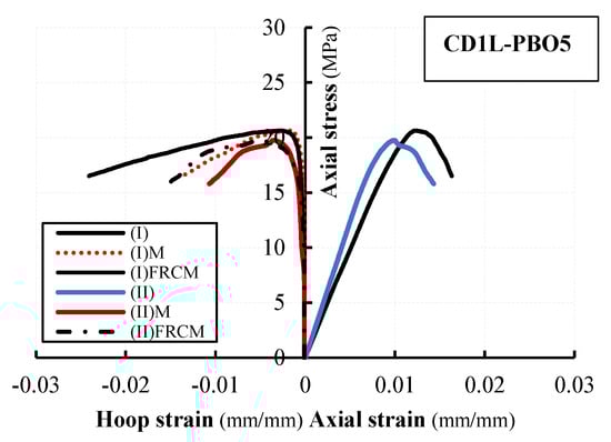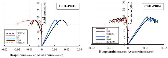 Figure 8 and Figure 9 report the hoop strain values measured in the un-confined masonry (the curves are labeled with M) and those recorded in the confining jackets (the curves are labeled with FRCM). Figure 8 and Figure 9 evidence that the behavior of PBO FRCM—partially confined masonry columns can be described as a nearly linear branch until the peak stress is reached; a descending softening branch is, then, observed until failure occurs. Figure 8 and Figure 9 show that the values of hoop strains are very small in comparison with axial ones; they become significant only when confinement is activated.