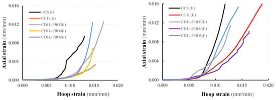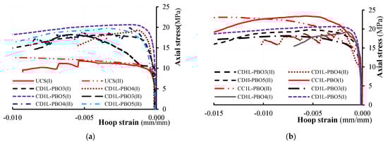 The analysis of the hoop strains variation in the un-confined (Figure 13a) and confined (Figure 13b) zones evidences a different behavior of partially confined columns as the vertical spacing ratio changes. For the highest value of the vertical spacing ratio (CD1L-PBO3 columns), after the cracking formation, the slope of the axial stress-hoop strain curves is less pronounced with respect to that of the other curves. This is an expected result because it depends on the damage produced by cracking, which, as described earlier, is more prevalent in columns where the unconfined zones are larger.