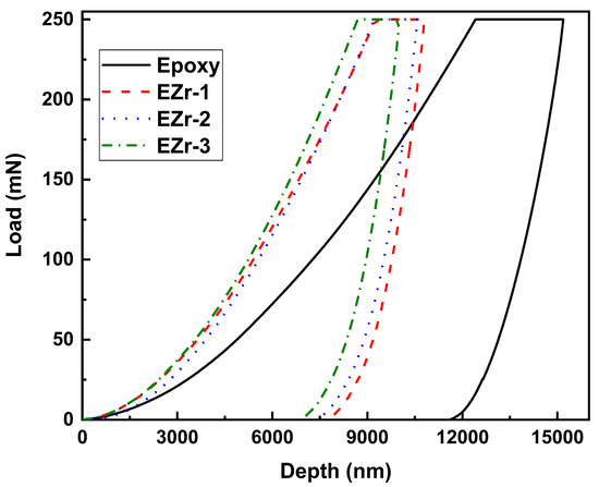 Nanoindentation was used to further analyze how adding ZrO2 nanoparticles affected the produced coatings’ mechanical properties. Indentations were carried out on all the prepared coatings utilizing a load management program. The coatings underwent strain against the Berkovich-type indenter up to a 250 mN load (maximum). The result of the nanoindentation test was the creation of a graph (Figure 4) showing the relationship between the applied force and the corresponding penetration depth during two different stages, loading and unloading. During the nanoindentation test, the penetration depth increased as a function of the applied load. In the nanoindentation curve, during the loading process, both types of deformation (elastic and plastic) occur; therefore, the loading portion is representative of both deformations, while after reaching maximum load, the unloading cure represents only elastic behavior. This unloading curve is used to calculate the elastic modulus.