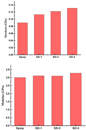 The increase in nanoparticle percentage increases hardness due to the reduction in free volume and higher cross-linked density. The decrease in free volume restricts the chain movement upon indentation. Because nanoparticles make it difficult to be affected by outside forces, their inclusion in epoxy causes an improvement in coating qualities. Because of its smaller size, there is a possibility of the indenter landing in an area where particles were agglomerated, resulting in higher hardness and lower elastic modulus properties [24,25].
