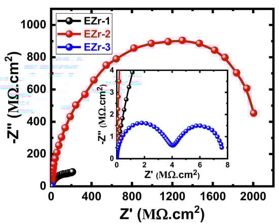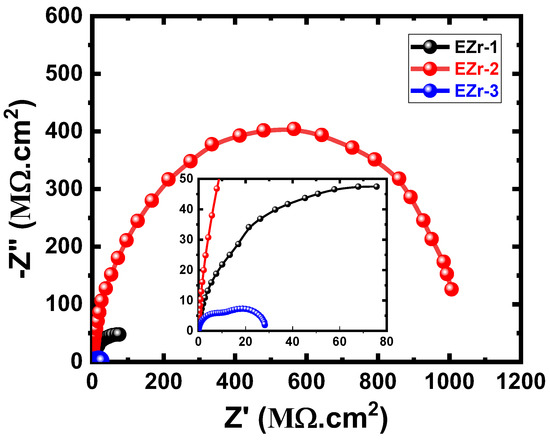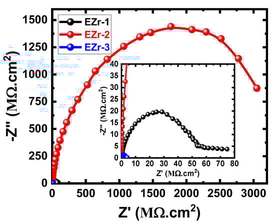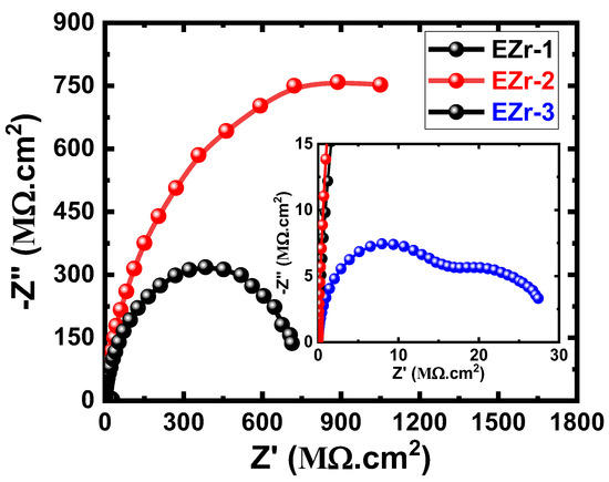 The EIS method has been reported as a powerful technique in studying the prevention of corrosion using coatings [23,26,27,28,29,30,31,32]. We have employed EIS to report the performance of the fabricated coatings against corrosion after various exposure times in NaCl electrolytes. Figure 6 shows the Nyquist plots for the coated steel samples (EZr-1, EZr-2, and EZr-3) after their exposure in 3.5% NaCl for 1 d before measurement. Similar plots were also obtained after 7, 14, 21, and 30 d, as shown in Figure 7, Figure 8, Figure 9 and Figure 10.