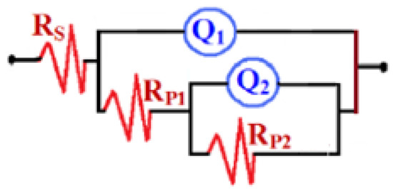 Our EIS data have been fitted to the circuit model that is seen in Figure 11, and the values obtained from this circuit are listed in Table 5. Here, the symbols of the circuit of Figure 11 can be defined according to the universal definition as follows: RS is the solution resistance, Q1 is the first constant phase elements (CPEs), RP1 is the first polarization resistance at the interface of the steel panels and the coatings, Q2 is a second constant phase element, and RP2 is another polarization resistance at the interface of the coating layers and NaCl solution.