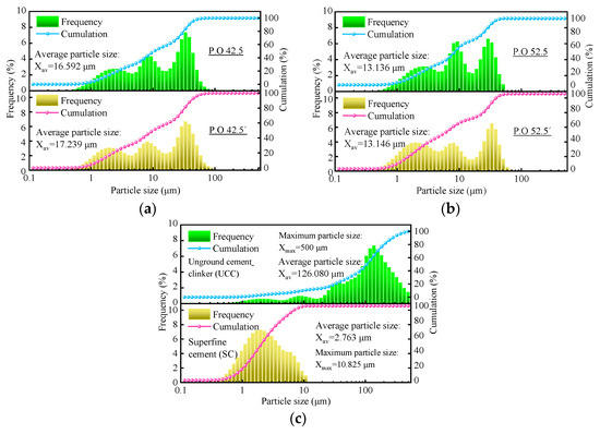 The particle size distribution of cement clinker is shown in Figure 2. From the figure, the average particle sizes of the reference samples of P.O 42.5 cement, P.O 52.5 cement, and cement clinker are 16.592 μm (Figure 2a), 13.136 μm (Figure 2b), and 126.080 μm (Figure 2c), respectively. When the grinding time was 30 min, 90 min, and 300 min, the average particle size of cement clinker was 17.239 μm (P.O 42.5′), 13.146 μm (P.O 52.5′), and 2.763 μm (SC), respectively. Particle size distribution of P.O 42.5′ and P.O 52.5′ clinkers are similar to those of P.O 42.5 and P.O 52.5 cement, respectively. The average particle size (Xav = 2.763 μm) and the maximum particle size (Xmax = 10.825 μm) of SC clinker completely meet the technical requirements of superfine cement (Xav < 5 μm, Xmax < 10.825 μm) [39]. Therefore, the materials used in the subsequent tests are P.O 42.5′, P.O 52.5′, and SC, respectively.