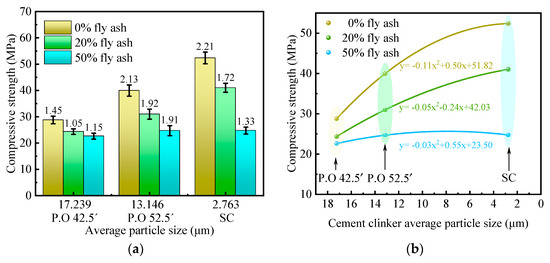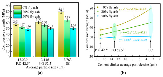 To clearly characterize the relationship between the compressive strength of the specimen and the particle size, the relevant data in Figure 3a are fitted to the image as a function shown in Figure 3b. From the figure, when the content of fly ash is the same, the compressive strength of the specimen increases with the decrease of cement clinker particle size. For example, when the amount of fly ash is 0%, the compressive strength of the SC specimen is 52.38 MPa, which is 1.8 times that of P.O 42.5′ specimen. This indicates that reducing the fineness of cement can greatly improve the early strength. The reason is that the smaller the fineness of the cement, the faster the hydration rate and the more hydration products. This is also on the basis of a small amount of superfine cement mixed with a large number of low-activity mineral admixtures can still have sufficient mechanical strength.