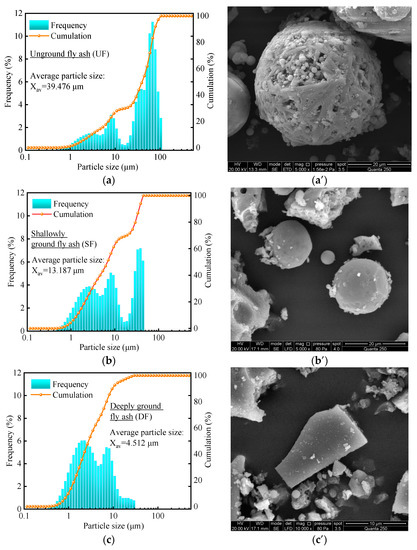 Figure 6 shows the particle size distribution and morphological changes of fly ash. Figure 6a shows that the particle size distribution of unground fly ash (UF) is scattered and has more large particles, and the average particle size (Xav = 39.476 μm) is much higher than that of P.O 42.5 cement (Xav = 16.592 μm), which is commonly used in the cement industry. Figure 6a’ shows that the UF particles are formed by many small particles agglomerated together, and there are a large number of holes and voids inside. Therefore, UF has many defects, and it is difficult to bring out the high mechanical properties.