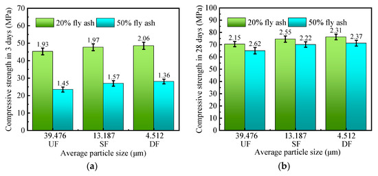 Effect of fineness of fly ash on compressive strength. (a) Compressive strength in 3 days; (b) Compressive strength in 28 days.