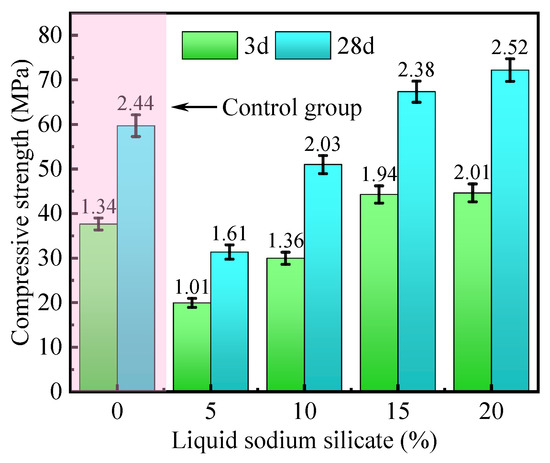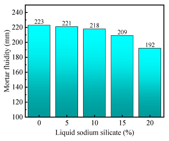 Superfine cement and H2 were used as cementitious materials to form mortar specimens. H2 replaced 90% of the superfine cement with an equal mass. The amount of liquid sodium silicate (measured by solid content) was 0%, 5%, 10%, 15%, and 20% of the cementitious material, respectively. The liquid–solid ratio was 1/2.5 (included water in liquid sodium silicate). The cement–sand ratio was 1/3. The specimens were numbered as D-1, D-2, …, D-5 in order. The compressive strength was measured after standard curing to 3 days/28 days. Meanwhile, the fluidity of mortar was tested. The details of the mortar mix proportions are shown in Table 5.