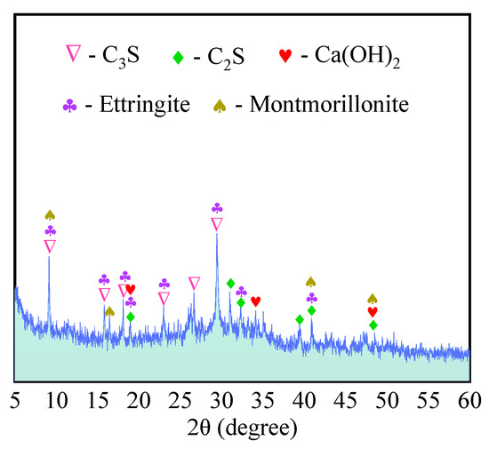 Small amounts of sulfate and alkali-activated specimens were crushed and ground into powders with particle sizes less than 200 meshes, and their compositions were tested by X-ray diffraction (D8 ADVANCE, Saarbruecken, Saarland, Germany). It was used to study the degree of hydration of mineral admixtures. Sulfate and alkali-activated specimens of relatively regular volume were taken and placed in an ion sputterer for surface gold spraying. Afterwards, the microstructure of the specimens was observed using an ambient scanning electron microscope (Quanta 250, Hillsboro, OR, USA). It was used to study the reverse filling effect of ultrafine cements.