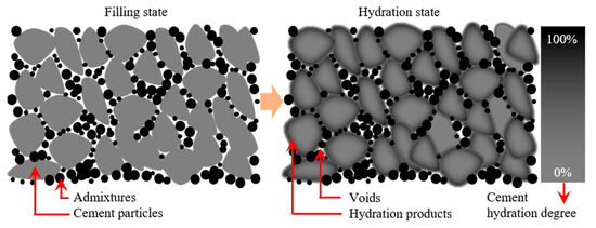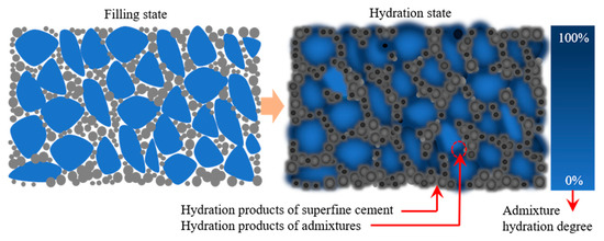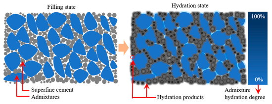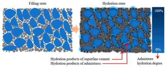 The principle of alkali-activated based on reverse filling action is shown in Figure 20. When the liquid sodium silicate makes contact with superfine cement mixture, it first transforms to silica gel and releases a large amount of OH−. The OH− penetration into the glass body of the mineral admixture causes covalent bonds such as Si–O–Si, Al–O–Al, and Si–O–Al to break. The breakage of the chemical bond promotes the dissolution of the mineral admixture. The dissolved silica-alumina component reacts with the calcium component in the liquid phase to produce a large amount of hydration products such as hydrated calcium aluminosilicate. It forms a three-dimensional network structure different from the traditional structure of hydrated calcium silicate. The two structures interweave, resulting in a significant increase in the density and mechanical properties of the hardened cement paste.