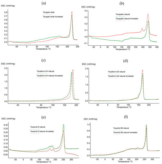 DSC thermograms of the tested materials before and after the annealing process: (a) Tecapet white, (b) Tecapeek natural, (c) Tecaform AH natural, (d) Tecaform AD natural, (e) Tecamid 6 natural, (f) Tecamid 66 natural.