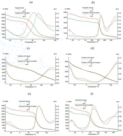 In the case of the tested materials, the method of preparation and the thermal history of the samples also affected the mobility of macromolecular segments and the nucleation, growth and orientation of crystallites. The glass transition temperature depends on the chemical and molecular structures of the polymer. For all the tested materials, lower values of the glass transition temperature after the annealing process were recorded, with the largest differences obtained for Tecapet white, Tecapeek natural, Tecamid 6 natural and Tecamid 66 natural. These dependencies were confirmed by the tests carried out using the DMTA method.