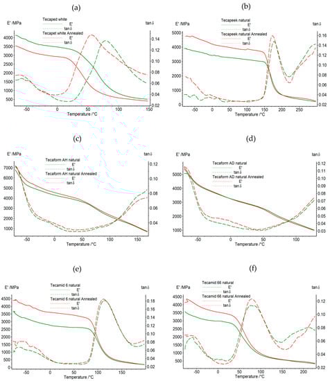 The dependence of the conservative modulus value and mechanical loss tangent versus temperature at a frequency of 10 Hz before and after the heat treatment process of tested materials: (a) Tecapet white, (b) Tecapeek natural, (c) Tecaform AH natural, (d) Tecaform AD natural, (e) Tecamid 6 natural, (f) Tecamid 66 natural.