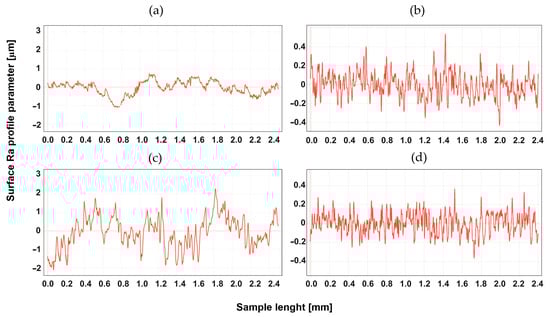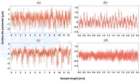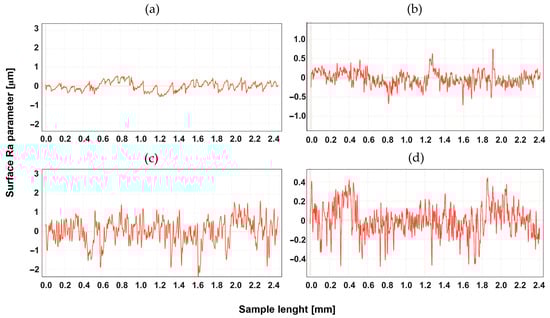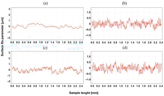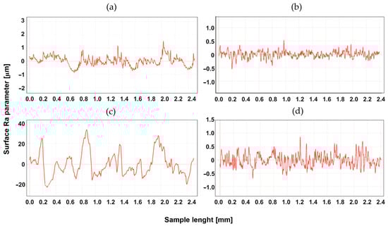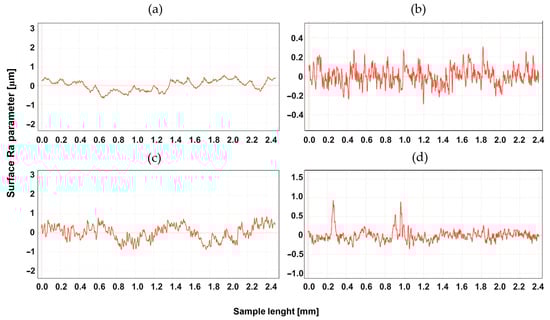 The profiles of the tested material before annealing were similar. The annealing process resulted in a significant reduction in roughness for both types of machining in a similar range. It was found, however, that for up-milling, the Tecapeek natural’s surface was shaped in a different way than for down-milling—characteristic faults could be observed, which were not visible in the profile for up-milling. Figure 6 shows the profiles for Tecaform AH natural. In this case, the annealing process did not significantly change the profile. There were also no particular differences between the profiles for up-milling and down-milling. Figure 7 shows the roughness profiles for Tecaform AD natural.