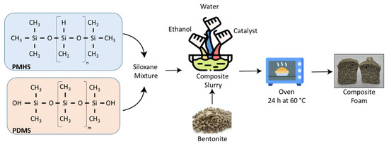 The composite foams were produced according to the procedure reported in [34,35]. The silicone foam was manufactured by using a direct dehydrogenative reaction between siloxane compounds, which was used as a foaming reaction to produce all the composite foams [36]. In particular, trimethylsilyl-terminated Poly(dimethylsiloxane-co-methylhydrosiloxane) (PMHS, M.W. 5500–6500) and silanol-terminated polydimethylsiloxane (PDMS, M.W. 1,100,000) compounds were mixed under magnetic stirring (PDMS/PMHS weight ratio 2:1) for 60 s. Afterward, bentonite powder was progressively added as filler, always under magnetic stirring, until a homogenous slurry was achieved. Furthermore, with the purpose of reducing the viscosity of the composite slurry and to favor physical bubbling, bi-distilled water and ethanol were added into the mixture [36,37]. To activate the dehydrogenative coupling reaction between the siloxane compound, Tin(II)2-ethylhexanoate(Sn(II)) (density: 1.251 g/mL, purity > 92.5%), supplied by Sigma Aldrich (St. Louis, MO, USA), was added as catalyst. Finally, the homogenous composite mixture was poured into a cylindrical aluminum mold (diameter 2 cm, height 5 cm) and placed in an oven (24 h at 60 °C) to activate the foaming process. This latter process is due to the reaction of the hydroxyl and hydrate groups of PDMS and PMHS compounds, respectively, leading to hydrogen gas as the reaction product that acts as a foaming agent [38]. Figure 1 summarizes the synthesis steps of the composite bentonite–silicone foam. Furthermore, Table 1 shows the bentonite–siloxane solution composition of all the composite foams (all percentage are by weight).
