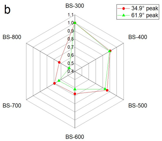 (a) XRD analysis of the investigated thermally treated clays and (b) polygon plot of the peaks related to the hydrated phase, positioned at 2-theta: 34.9° and 61.9° of the normalized diffractograms.