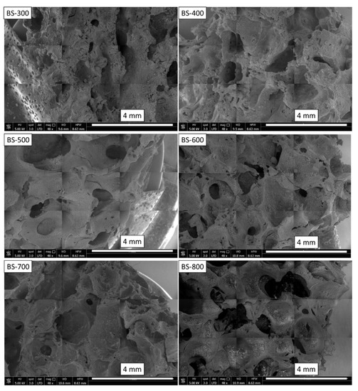 The average pore size (APS) of the investigated foams, together with the apparent density (ρa) of the composite foam at varying filler typologies, is reported in Table 2. By increasing the temperature of the thermal treatment from 300 °C to 400 °C, an increase in the pore size was detected: 1.02 mm and 1.36 mm, respectively, for BS-300 and BS-400. No evident change in the pore size of the foam was found when we raised the temperature of the bentonite treatment to 600 °C. However, the temperature treatment at 700 °C and 800 °C leads to an enlargement of the pores of the composite foam, reaching 1.83 mm and 2.18 mm, respectively, for BS-700 and BS-800 [42]. Therefore, by increasing the APS, the apparent density decreases; in particular, a 45.2% decrease from sample BS-300 to sample BS-800 was calculated. For samples BS-400, BS-500 and BS-600, the ρa values remain almost the same. This behavior could be related to the modified surface polarity of the filler that contributes to the chemical foaming process of the PDMS silicone foam, considering that during its dehydrogenative coupling, a reaction hydrogen gas is produced, thereby triggering the foaming process [43]. This can be related to the presence of electronegative groups on the filler surface which, by interacting with the hydride siloxane (PMHS), support the reaction process by stimulating a greater expansion of the foam [37]. As indicated in Table 2, this can be identified from the progressive increase in the size of the pores and the consequent progressive reduction in the apparent density as the temperature of the heat treatment applied to the bentonite increases.