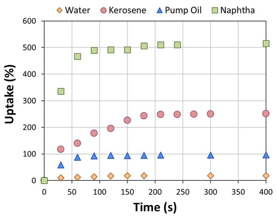 Conversely, in the presence of hydrocarbons liquids, the foam exhibits a significantly higher uptake. The maximum sorption capacity was found in naphtha, where an uptake to equilibrium equal to 515.7% was acquired. The trend of the uptake curve in this liquid also makes evident that the sorption kinetic is very rapid. In fact, after about 60 s of floating in naphtha, an increase in weight close to that of the equilibrium was acquired. In kerosene and pump oil, a lower sorption capacity was found, equal to 251.5% and 96.2%, respectively. The sorption capacity follows the following order: pump oil < kerosene < naphtha. This can be attributed to the dynamic viscosity of the investigated oils [44]. The lower the dynamic viscosity, the higher the sorption capacity. Dynamic viscosity is a measure of a fluid’s resistance to deformation; thus, it is logical to surmise that pump oil with a higher dynamic viscosity (0.1231 Pa*s) has difficulty in entering the pores of the foam. On the other hand, oils with a lower resistance to deformation (dynamic viscosity of kerosene and naphtha, 0.0019 and 0.0012 Pa*s, respectively) can be easily sorbed by the composite foams. However, this behavior is also influenced by the oils’ high affinity with the foams.