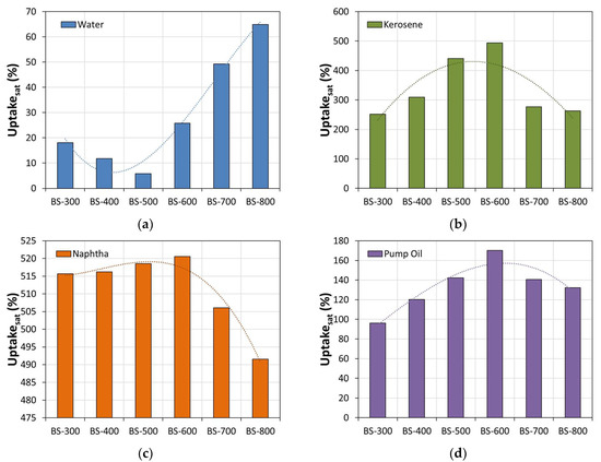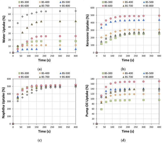 The sorption capacity (uptake) at increasing sorption time for the foams with varying bentonite filler in all liquids is shown in Figure 5. Some relevant information can be attained in order to assess the water uptake evolution during the sorption time of all of the foams (Figure 5a). All batches highlighted a progressive increase in uptake with increasing sorption time. A similar trend can be observed by evaluating the sorption capacity of the bentonite–PDMS foams in all other liquids (Figure 5b–d). Moreover, by increasing the treatment temperature, the bentonite releases structural water, which leads to a greater interaction between the sorbent surface and the oils. All kinds of bentonite treated at 400–600 °C can better improve the surface area. The structure of bentonite is not damaged, and has enough activity to facilitate the sorption of organic matter [45]. However, following an excessive heat treatment, the structure becomes compact [40] and no longer allows for an easy sorption process. In synergy with this, there is a progressive increase in foams’ pores as the treatment temperature of the bentonite increases (Table 2) due to a progressive reduction in the number of reactive sites in the sorbent, which enhances the foaming ratio in the silicone constituents. Due to these factors, an optimum sorbent performance has been found for the BS-500 and BS-600 formulations.