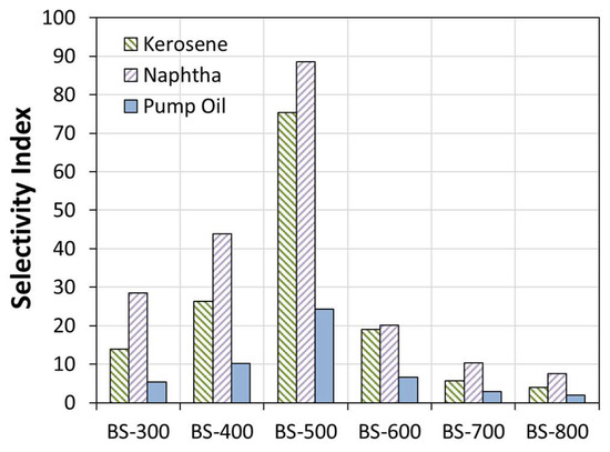 Composite foams made of filler treated at higher temperatures (BS-600, BS-700 and BS-800) show a progressive decay in the oil–water selectivity index in all oils. In particular, evaluating the BS-800 batch, SI indices are always below 10, regardless of the analyzed oils. This behavior is due both to the increased surface hydrophilicity (water uptake approximately 65.0%) and to the ineffective sorption capacity found with hydrocarbons (see Figure 6).