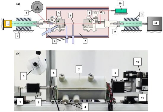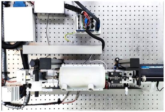 The whole setup is mounted on a “ThorLabs” rail system (Figure 4) combined with milled custom adapters and positioning stages for a precise alignment of the setup. The outer measurements of the mechanical setup are 800 mm × 350 mm × 200 mm (l × h × w). The setup is installed on an optical table with air damping to keep shocks and vibrations in the environment of the setup from interfering with the highly sensitive force measurement.