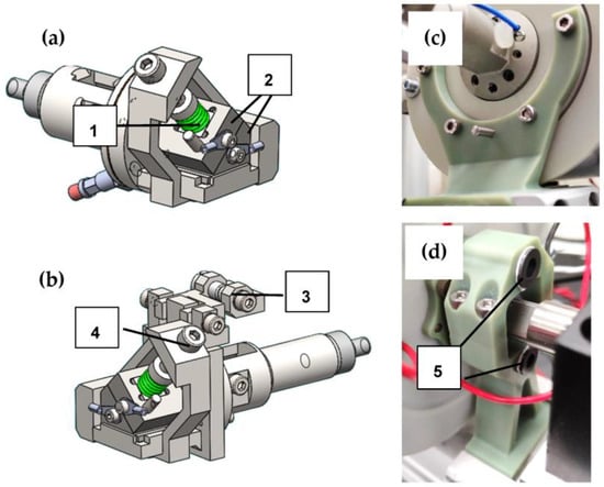 On (a,b), the CAD designs of both wire clamps are displayed. Image (c) shows the fixed bearing of the isolating chamber, and (d) illustrates the floating bearing, which allows for a thermal expansion. The following parts are displayed: 1: spring to load the clamps, 2: clamping jaws, 3: guiding rollers for the SMA wire, 4: bolt to manually tighten clamps, 5: linear guides for thermal expansion of isolating chamber.