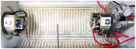 Microwires need to be shielded from irregular air flow and variable convection. Slight air streaming in a room, which occurs, for example, due to the air condition, influences the wire temperature and leads to irregular measurement results. For this reason, the developed setup features a cylindrical chamber with a diameter of 90 mm and a length of 200 mm, in which the wire sample as well as the clamps to fix it are placed. The upper half of the chamber (part 7 in Figure 1b) can be removed to access the wire and the clamps. Inside, a heating foil is attached to the chamber’s walls, which is depicted in Figure 3. In combination with PT100 temperature sensors, the temperature within can be precisely controlled and monitored to set points of up to 100 °C. To account for the expansion of the material when the chamber is heated, the mounting points are located close to the axial center of the cylinders faces, including a floating bearing on one end. With these measures, which are depicted in Figure 2c,d, blockage of the moving clamps due to thermal expansion of the chamber is prevented, and an annular gap for the clamps of less than 0.5 mm is set.