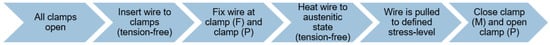After all clamps are opened, the specimen is mounted to the fixed wire clamp (F) and the preloading drive (P) outside the chamber (Figure 1). The moving wire clamp (M) stays open, and the wire is only guided through it. The wire is pulled by the preloading drive, while it is electrically heated above Af temperature, until the defined stress of 10 MPa is reached. Then, the bolt of clamp (M) is tightened to fix the specimen, and the installation process is finished. The heating current is switched off, and clamp (P) is opened. After this process, the SMA wire sample is known to have a L0 of 100 mm, and it is ready for the following experiments.
