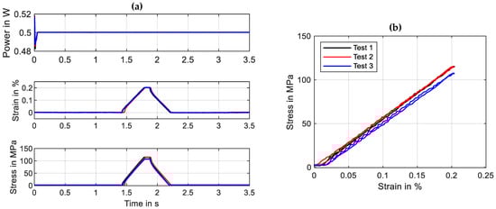 Results of the validation experiments for the wire installation process. Depicted are input and output parameters over time in (a) and stress over strain in (b). Test parameters: tensile test, max. strain 0.2%, strain rate 0.005 s−1, wire specimen “SAES Getters Smartflex” 100 µm, electrical heating power 0.5 W, 3 iterations.
