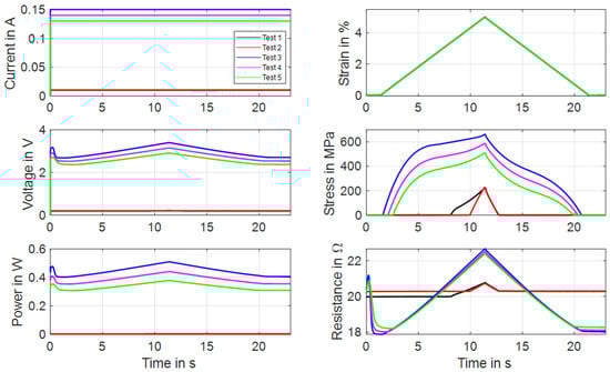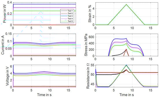 The first function of the test rig to be introduced are tensile tests in which the maximum strain, strain rate and heating method are variable parameters. The results are used for a basic characterization of actuator wires and allow for evaluation and comparison, for example, of different alloy compositions and transformation temperatures. For this exemplary experiment, the wire is heated with a constant electrical power and stretched to 5% strain with a strain rate of 0.01 s−1. A “Dynalloy Flexinol LT (70 °C)” NiTi wire with a measured diameter of 49 µm is used [33]. To examine the tensile characteristics under different conditions, five tensile tests are performed in a certain order. Before the experiment starts, the sample undergoes the previously introduced reset procedure, in which it is heated to full austenite and cooled down without tensile stress. The first tensile test is conducted with no power applied, but 5 mA of measuring current is used to calculate the resistance. This test is repeated once. Then, three more tensile tests are performed with high power (0.37 W), medium power (0.31 W) and low power (0.25 W). For evaluation, the acquired data are plotted over time and can be seen in Figure 7. In between each of these iterations, the reset procedure is omitted.