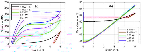 The first two tests, in black and red color, show the martensitic material characteristics. In the first experiment, a detwinning of the martensite can be observed that builds under stress-free cooling from austenite to martensite. After the material is detwinned, the second tensile test shows the purely elastic behavior of martensite. In Figure 8, the results of stress and resistance are plotted over strain. Here, the martensitic detwinning and the elastic branch can be observed as well. In Figure 8a, the typical stress–strain hysteresis with varying transformation plateaus depending on the heating power is recognizable, and in Figure 8b, a linear change in resistance under a tensile load with constant heating power is evident.