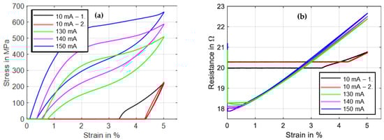The method of the experiments is the same as mentioned in Section 3.2, and the heating is controlled with a constant current instead of constant power. The first tensile test is conducted with 5 mA of measuring current to calculate the resistance. This test is repeated once. Then, three more tensile tests are performed with high current (150 mA), medium current (140 mA) and low current (130 mA). As can be observed in Figure 10a, the main difference from constant power heating is that the slopes of the transformation plateaus are steeper and less distinct, due to the increase in electrical power with increasing wire resistance. A detwinning of the martensite is also evident in this sample for the first tensile test. The amount of twinned martensite and, with it, the intrinsic two-way-effect of a SMA wire are varied in between samples. This depends on individual load history as well as the training and the alloy composition [36]. With the help of the austenitic and martensitic branch of the stress–strain curves in Figure 10a, as well as the resistance–strain graph in Figure 10b, the first important tool for the design of a SMA actuator is available.