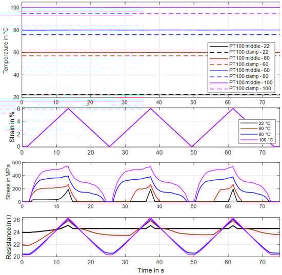 Results of tensile tests with a wire specimen by “Ingpuls GmbH” of 73 µm diameter with varied ambient temperature. Three iterations are performed for each temperature. All results are plotted over time. Test parameters: max. strain 6%, strain rate 0.005 s−1, measurement current 10 mA.