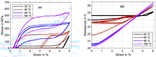 The shape of the stress–strain hysteresis in Figure 12a, for temperatures of 80 °C and higher, shows the typical austenitic characteristics, as can be expected for an actuator wire. For the experiment at room temperature, the same detwinning effect in the first cycle as in the previous subsections can be observed. The set of tensile tests at 60° C ambient temperature shows that the material is already partially transformed to austenite. To achieve the resistance values, a measurement current of 10 mA is applied during all experiments. The results of the resistance measurements are plotted over strain in Figure 12b. The typical linear behavior is observed at 22 °C, 80 °C and 100 °C. The 60 °C experiment shows a hysteretic characteristic, as the sample seems to partially transform back to austenite when it is fully relaxed.