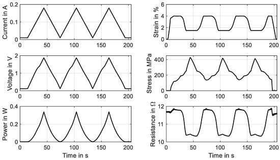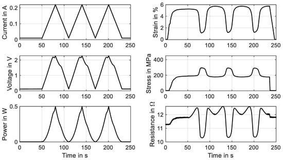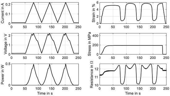 The test sequence is started with only the measurement current of 10 mA applied to achieve continuous resistance measurement results from the experiment’s start. The linear drive is moved to pull the wire to the preset force value of 1.48 N, which results in a material stress of 188 MPa. When the setpoint is reached, a triangular current signal with a maximum value of 220 mA and a signal duration of 60 s, as displayed in Figure 13, is run three times. This results in the wire contracting to a strain of 0.7% and releasing back to 5.7% of absolute strain. A difference between the initial cycle and the next cycles can be observed in the strain and stress signal in Figure 13 as well as in Figure 14a. The reason for this behavior lies in the detwinning of martensite in the first cycle. In the reset procedure that is performed before each set of experiments, martensite in a twin structure is generated because of the “load-free” condition in the experiment. In the last two cycles of the experiment, the biasing stress only allows for the formation of detwinned martensite.