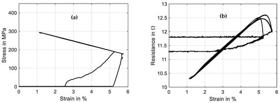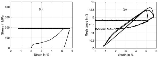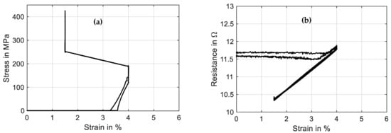 The results of stress and resistance plotted over strain are displayed in Figure 17. The same difference in the initial cycle can be observed as in Section 3.5 due to twinned martensite formed in the reset procedure before the actual experiment. The stress–strain curve follows the spring characteristic and exhibits a stroke of 4.5% in stable conditions after the first activation. The actuator cycles between 170 and 295 MPa. In the strain–time trend of Figure 16, it is observed that the maximum stroke is slightly reduced with ongoing cycling. The SMA behavior is not stable in the high-stress region, and a residual strain builds up.