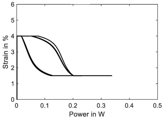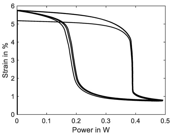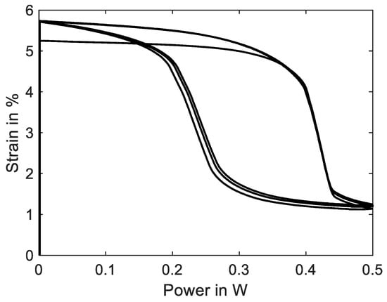 The SMA wire is heated electrically and quantitative temperature measurements of micro wires cannot be performed in this test setup and neither can the wire temperature be measured in SMA-driven applications. The power–strain diagram is shown in Figure 15 and can be compared to a typical temperature-over-strain diagram. As the experiment is conducted in a quasistatic manner due to the slow heating rate, a correlation between electrical power and temperature is allowed [8]. The typical shape of a SMA temperature–strain hysteresis can be qualitatively observed in the power–strain plot as well. In systematic experiments, these plots can be used to achieve the austenite start and finish power of a wire sample for various loads. With the help of temperature-controlled experiments, a comparison is possible as well.