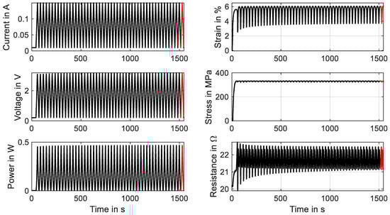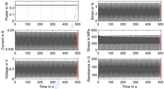 A power-controlled electrical supply is uncommon in SMA applications due to the complexity and lack of benefits. For scientific tests, on the other hand, this is of interest, because a constant heating power equals a constant temperature if the strain rate and the rate of the change in power are sufficiently small [34]. As the main target of the setup is to provide measurement data that are of relevance for applications, experiments with constant current to heat the wire are also part of the test portfolio and are presented in the following. In the example depicted in Figure 9 and Figure 10, a strain rate of 0.005 s−1 at a maximum strain of 5% is chosen for a “Fort Wayne Metals NiTi #5” wire with a measured diameter of 73 µm [35].