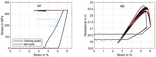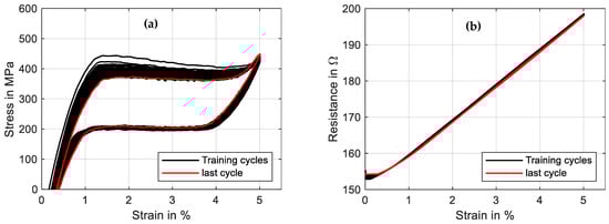 Results of a cyclic actuator test with a wire specimen “Fort Wayne Metals NiTi #5” of 73 µm diameter under constant load biasing. A triangular current signal with an amplitude of 160 mA and a signal duration of 30 s is applied. Fifty activation cycles are conducted for the training experiment, of which the stress–strain diagram is plotted in (a), and the resistance–strain behavior is plotted in (b). The final cycle is depicted in red.