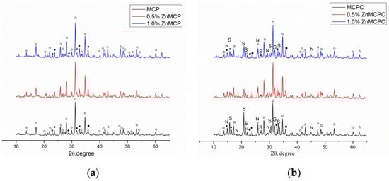 The aim of the present study was to determine the effects of Zn2+ ions introduced to MCPCs. According to the XRD analysis, it was revealed that initial powders are characterized by the presence of whitlockite, stanfieldite, and MgO phases. The greater amount of introduced Zn2+ raised the concentration of MgO because there was a large quantity of Mg2+ displaced by Zn2+ ions in the stanfieldite lattice. After mixing the initial cement powder with a cement liquid, the main cementing phase (struvite) crystallized. One of the key findings in this study was that during cementing, the thermal reaction did not proceed at all in the tested compositions of the cement.