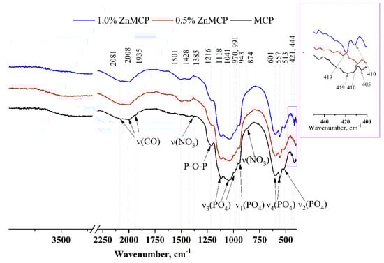 Infrared (IR) spectra of the obtained powders are given in Figure 3. A broad phosphate band in the region of 1200–900 cm−1 and well-resolved bands of ν3(PO4) at 1118, 1034, 991, and 970 cm−1 and ν1(PO4) at 943 cm−1 indicate that the structure of phosphate phases formed successfully. ν4(PO4) bands at 601 and 557 cm−1, as well as ν2(PO4) at 513 cm−1, are also clearly visible in all the materials. A broad peak formed by three bands at 1935, 2008, and 2081 cm−1 is related to the C=O vibration from residual acetone after sample milling. In the absence of dopant ions, this region has a wide band at 419 cm−1 and a low-intensity band at 405 cm−1. In the presence of zinc, a narrower band is observed for the 0.5 wt.% substitution at 410 cm−1, and for the 1.0 wt.% substitution, a doublet is seen at 419 and 410 cm−1.
